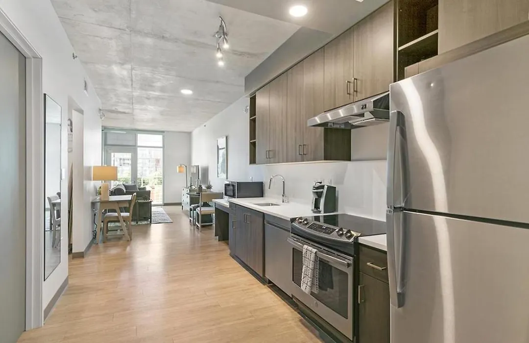 A fully-fitted kitchen at Landing - Modern Apartment With Amazing Amenities includes oven and a dishwasher. Ronstadt Transit Center bus station is only steps away from the apartment.